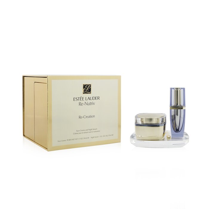 Re-Nutriv Re-Creation Face Creme 50ml/1.7oz Re-nutriv Re-Creation Night Serum 15ml/0.5oz A high-potency anti-aging day & night treatment duo Harnesses Glacial BioExtract™ & the highest concentration of Life Re-Newing Molecules™ Provides renewed radiance & striking vitality to skin The restorative Creme helps boost skin's natural collagen network Reduces fine lines while fading discoloration The Serum infuses skin with nourishment Unveils a smoother, clearer, more even-toned & younger looking complexion