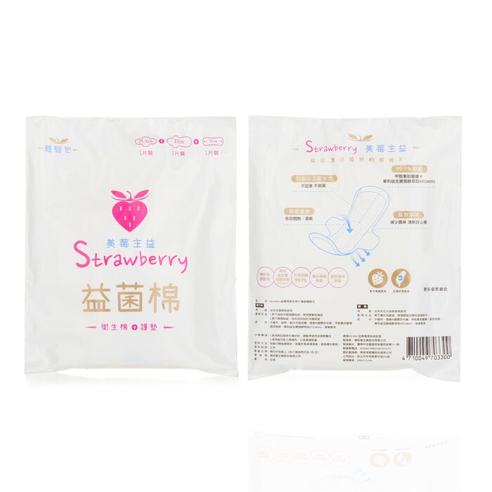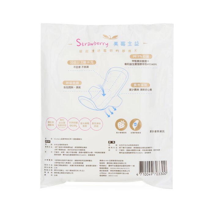 Probiotic Trial Pack: 1x Probiotic Pad 15cm 1x Probiotic Infinity 25.5cm 1x Probiotic Long Night 33cm Exclusive probiotic fermentation extract ATCC#8293: inhibits four major pathogens to reduce gynecological diseases Chitosan antibacterial protection layer: Chitosan high-pressure molecularization, 99% strong antibacterial protection Four lines of anti-leakage protection: anti-instantaneous flow, anti-backflow, anti-slope backflow, anti-side leakage Anti-bacteria feather soft surface layer: extremely light & soft feather cotton, suitable for sensitive skin Breathable base film for instant absorption & stuffiness prevention: nearly 1 million micron capillary breathable base film. High air permeability, high moisture dispersion, 35 times super absorbent layer Ultra-thin & weightless: 0.2cm to fit the body shape No fluorescent agent: SGS strict test passed Strawberry fragrance: gives you a fresh & good mood Hypoallergenic adhesive backing: easy to tear & stick Place of origin: Taiwan