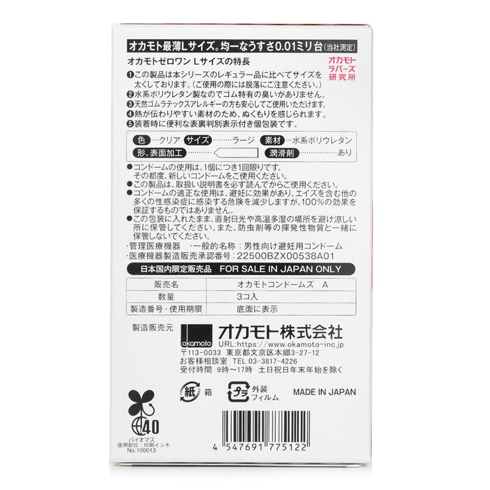 Width 58mm Okamoto 0.01 has now landed! Experience truly revolutionary thinness today! Transparent Lubricated WARNING: Keep the product away from children. DO NOT expose the product to humid places, direct UV or sunlight for an extended period.
