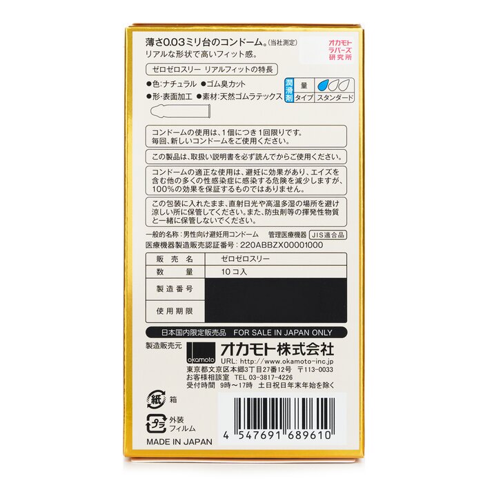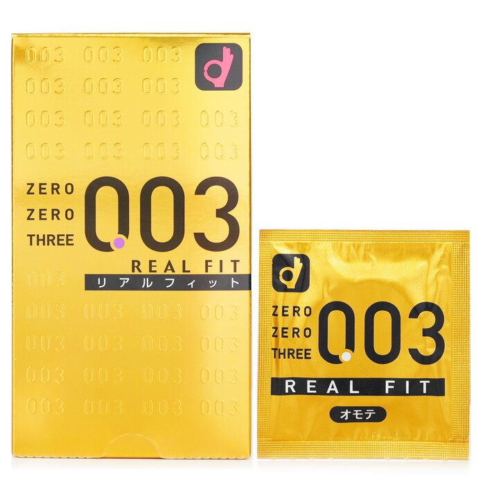 Zero Zero Three is one of the finest condoms available in the market. Okamoto struggled to challenge the manufacturing techniques required to make a fine yet strong latex condoms. Zero Zero Three has realized a big advancement in the manufacturing process. This Real Fit condom is soft and fine, realized an ultra tight feeling. Real Fit cutting The shape of Okamoto 0.03 Real Fit is designed according to the men's penis, which gives you and your partner a real feeling of LOVE. 0.03 Real Fit, fits your head. The teat is also removed from the condom design. You don't have to squeeze the air bubble before using it so that it is more hygiene. Odour masker Manufactured with the unique Okamoto technology, protein and water soluble materials in latex will be removed to cut the irritating smell of a condom. Easy distinguishable inside out design The touch of inside-out (male side and female side) are different so that you can tell which side to put on the condom even in a dark enviro Ultra fine, feels like nothing at all Zero Zero Three is just 0.03mm thickness, it feels like nothing at all and really fits you. The real fit shape make it just like another skin of yours to increase feeling during love making. WARNING: Keep the product away from children. DO NOT expose the product to humid places, direct UV or sunlight for an extended period.