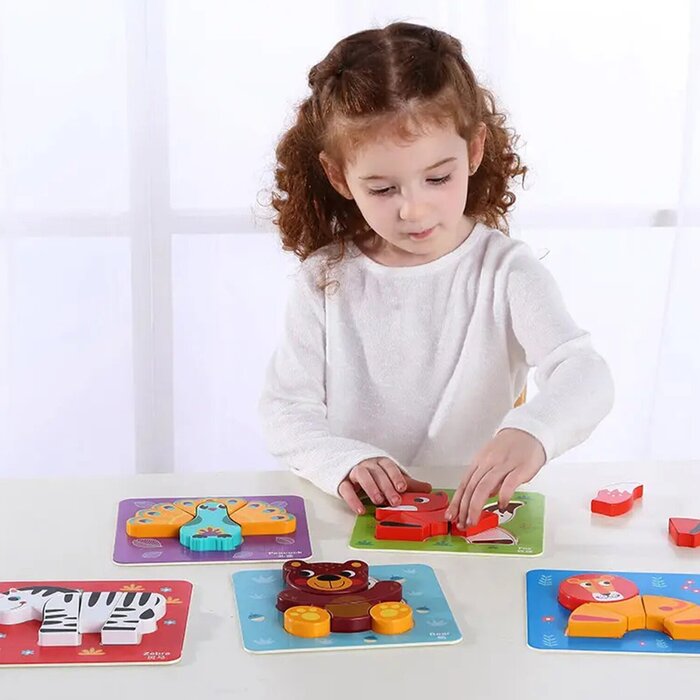 "Learning & Developmental Activity & Educational Preschool Toys - 6 In Mini Animal Puzzle Wonderful set containing six first puzzles to complete. The set includes six sturdy, colourful background cards. The cards have a recessed shape to build the puzzle in with a line drawing of the animal they are going to build. Match the chunky wooden pieces to the drawing to complete your puzzle. The recess in the card stops pieces sliding about as little hands develop the motor skills to assemble the puzzle. Six delightful animals to create. All comes packed in a convenient sturdy storage case. - Suitable for children aged 12 months + Content: Wooden Board x 6, Wooden Block x 28"