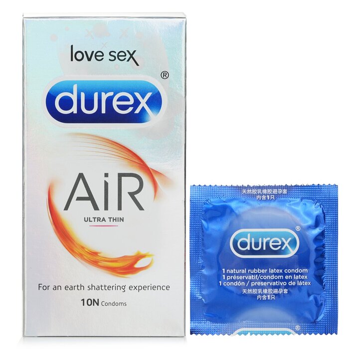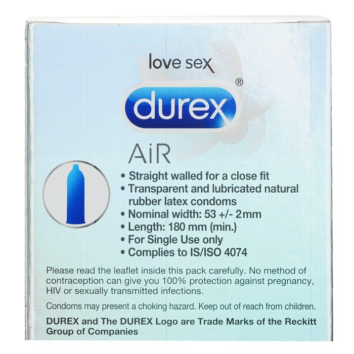 Width 53mm ULTRA THIN FOR HIGH SENSITIVITY - For a deep connection and real intense contact whilst maintaining the same level of security and protection, Durex Air condoms can make all the difference 10 LUBRICATED AND STRAIGHT WALLED CONDOMS - Transparent, natural latex condoms shaped with a teat end to be easier to put on and provide a better fit WARNING: Keep the product away from children. DO NOT expose the product to humid places, direct UV or sunlight for an extended period.