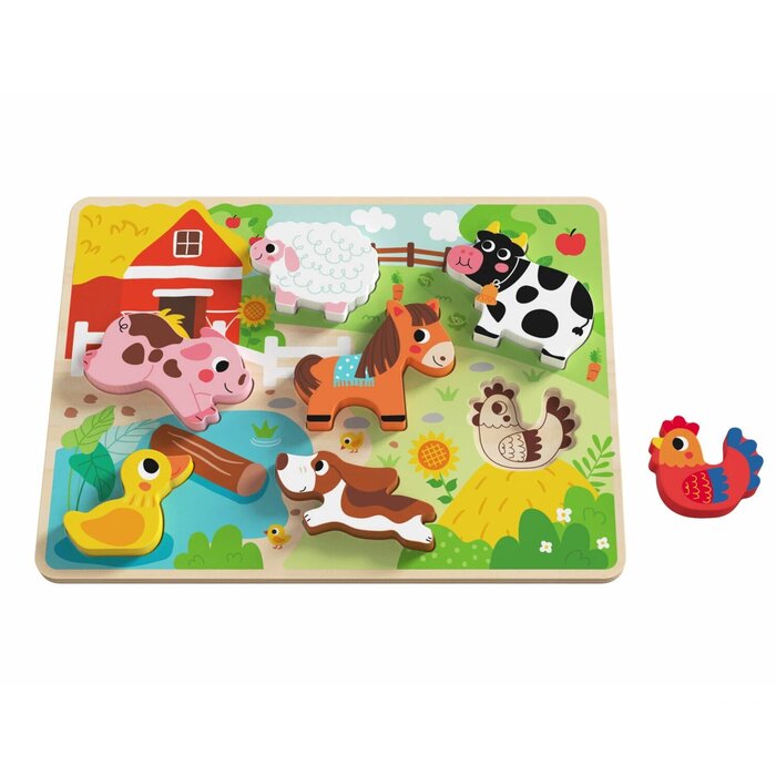 "Learning & Developmental Activity & Educational Preschool Toys - Chunky Puzzle - Farm - 8pcs Tooky Toy is a place to find creative alternatives to the wooden toys you love. Join us, let’s be creative. Do you know your different animals? The farm chunky puzzle is an easy way to identify all the different animals that live on the farm, including a dog! The easy to grab pieces fit in their own individual slots and easy to store. Suitable for children from the age of 12+ months Content: Wooden Block x 7, Wooden Board x 1"