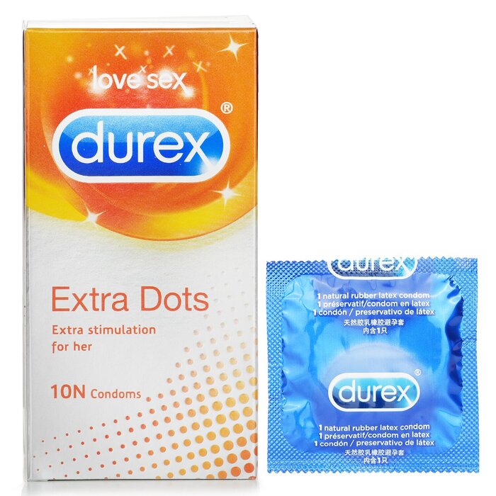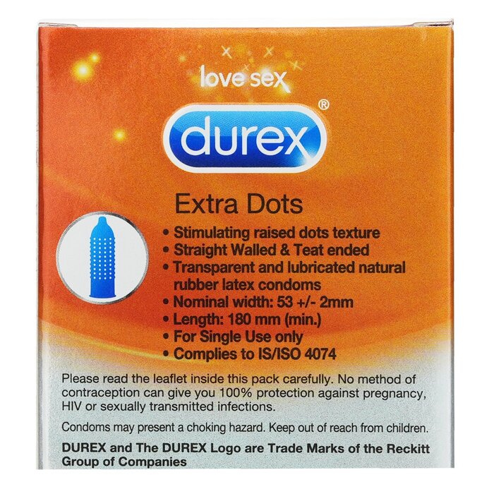 Width 53mm DOTTED FOR ENHANCED STIMULATION – Durex Extra Dotted condoms have a distinct texture of raised dots, designed to increase stimulation for you and your partner 10 LUBRICATED & STRAIGHT WALLED CONDOMS – Transparent, natural latex condoms shaped with a teat end to be easier to put on and provide a better fit WARNING: Keep the product away from children. DO NOT expose the product to humid places, direct UV or sunlight for an extended period.