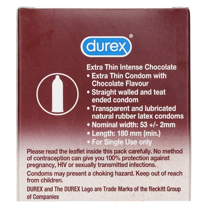 Width 53mm FLAVOURED - Sensually flavoured with intense chocolate flavour LUBRICATED AND STRAIGHT WALLED CONDOMS - Transparent, lubricated condoms shaped with a straight wall and teat end to provide a better fit WARNING: Keep the product away from children. DO NOT expose the product to humid places, direct UV or sunlight for an extended period.