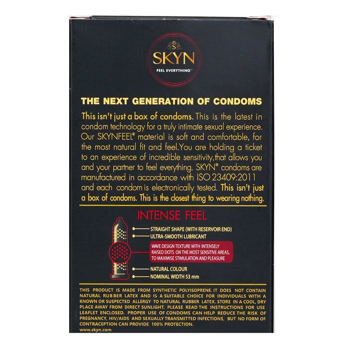 Width 53mm SKYN Intense Feel condoms have a wave designed texture and intensely raised dots. The dots are placed on the most sensitive areas to maximise stimulation and pleasure. These condoms are made from Skynfeel, a technologically advanced non-latex material, proven to enhance stimulation. It feels soft and comfortable that you'll barely notice wearing it, allowing you and your partner to feel everything. WARNING: Keep the product away from children. DO NOT expose the product to humid places, direct UV or sunlight for an extended period.