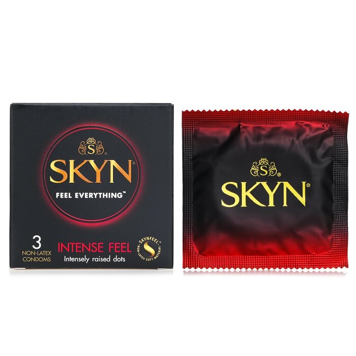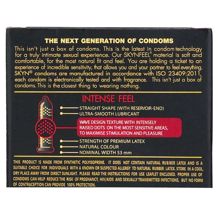 Width 53mm SKYN Intense Feel condoms have a wave designed texture and intensely raised dots. The dots are placed on the most sensitive areas to maximise stimulation and pleasure. These condoms are made from Skynfeel, a technologically advanced non-latex material, proven to enhance stimulation. It feels soft and comfortable that you'll barely notice wearing it, allowing you and your partner to feel everything. WARNING: Keep the product away from children. DO NOT expose the product to humid places, direct UV or sunlight for an extended period.