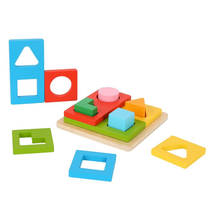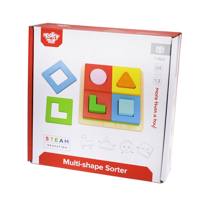 "Learning & Developmental Activity & Educational Preschool Toys - Muti-shape Sorter The multi shape sorter is a step up from the traditional shape sorter. Building up the layers of four different shapes with single and double shape tiles will challenge logical thinking and perseverance. A great resource for colour and shape recognition and an introduction to puzzles. Suitable for children from the age of 24+ months Content: Wooden board x 1, Wooden block x 4, Wooden Shape Block x 8"