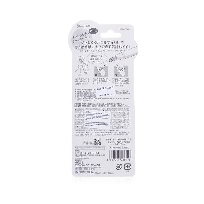 A cuticle oil pusher pen with six natural beauty ingredients Enriched with Lavender oil, Vitamins A, E, Avocado oil, Keratin & Squalane Deeply moisturizes & nourishes the dry area around cuticles Helps push finger’s cuticles while protecting nails Nails become brighter & healthier Makes nail color & styling more long-lasting Comes with a cap & travel-friendly Made in Korea