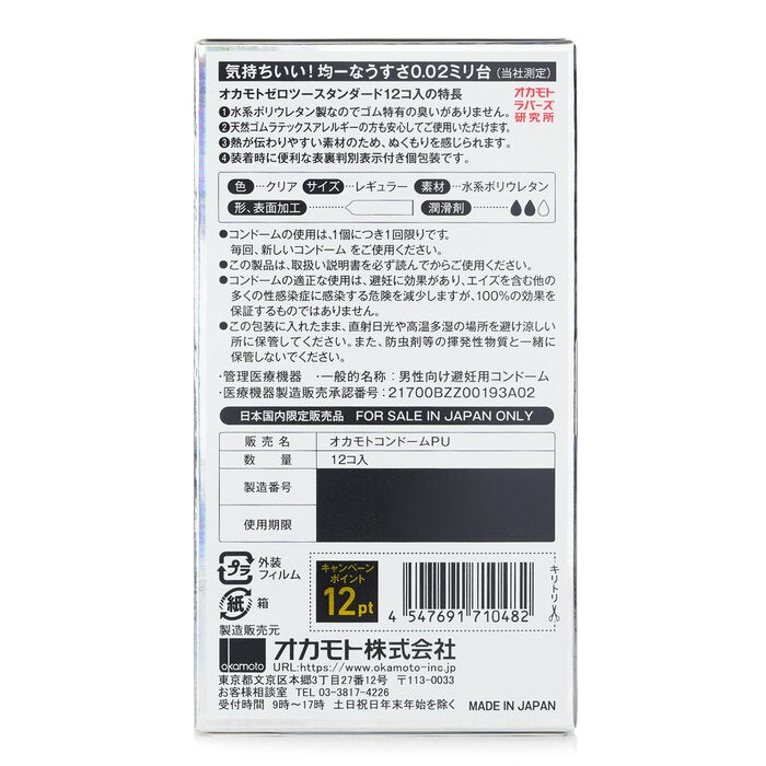 A condom that achieves a uniform thickness of 0.02 mm by three-point measurement Features uniform thinness from root to tip Surprisingly soft & gives no feeling of tightness when worn Directly conveys the warmth & sensation of partners Made of water-based polyurethane considering latex allergy Color: Clear Shape: Standard Lubricating Type: More lubricant/gel Made in Japan