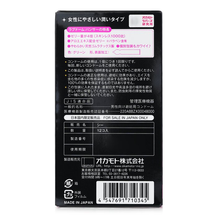 Easy-to-use condoms with only 0.03mm thickness Fashionable panther print packaging was designed with the concept of "easily carried by women" Feature an increased amount of lubricating jelly containing aloe extract (aloe vera) -four times more than normal condoms Provide extra smoothness & skin protection Made of latex for exceptional elastic properties Color: Green Made in Japan