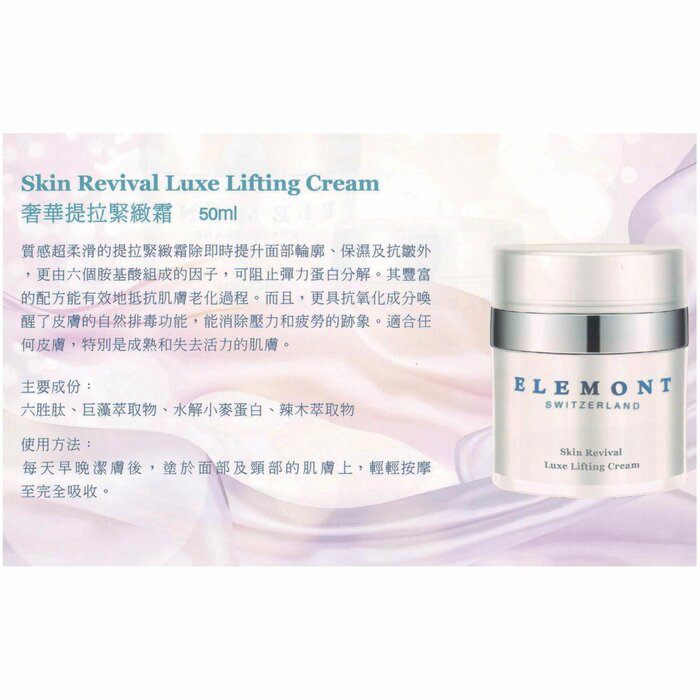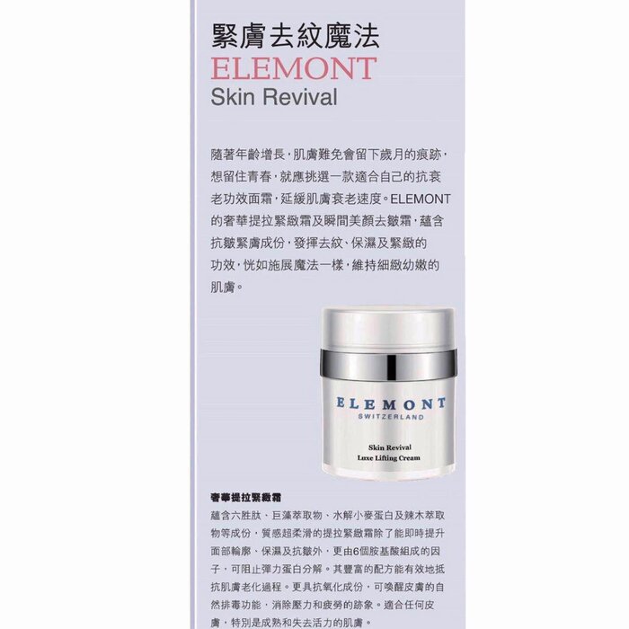ELEMONT - Skin Reviva Luxe Lifting Cream (Lifting, Firming, Hydrating, Antioxidant)(e50ml) E112  This super soft lifting cream offers an immediate beauty radiance boosting action, smoothing the skin’s profile and imparts true freshness and glow to the complexion. Thanks to its rich formulation, it efficiently contributes to the reversal of the aging process.