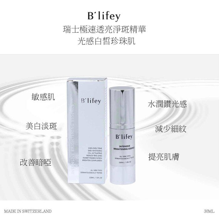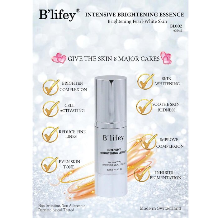 B'lifey – SwissIntensive Brightening Essence - Brightening Pearl-White Skin (Hydrating, Moisturising,Whitening, Antioxidant, Cell Activating) (e30ml) BL002 GIVE THE SKIN 8 MAJOR CARES EVEN SKIN TONE SKIN WHITENING CELL ACTIVATING REDUCE FINE LINES SOOTHE SKIN REDNESS IMPROVE COMPLEXION BRIGHTEN COMPLEXION INHIBITS PIGMENTATION DERMATOLOGICALLY TESTED Patent technology combined with the illuminating powerof Marshmallow root, Rice bran, Licorice root and Hydrolyzed pearl extract, itacts by complementary mechanisms on the cutaneous pigmentation process. Itprovides a brighter and more even complexion by inhibition of melanocytedifferentiation and proliferation. In-vivo study carried on Asian women shownthat in just 28 days, the complexion is enhanced by increasing lightness andluminance, and the quantity of melanin in dark spot is significantly decreased.Product is dermatologically tested and is not irritating.
