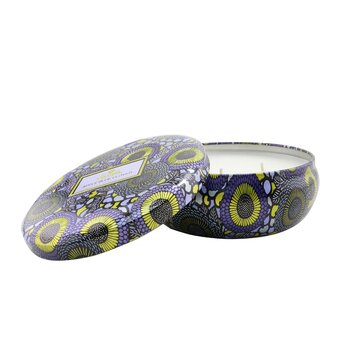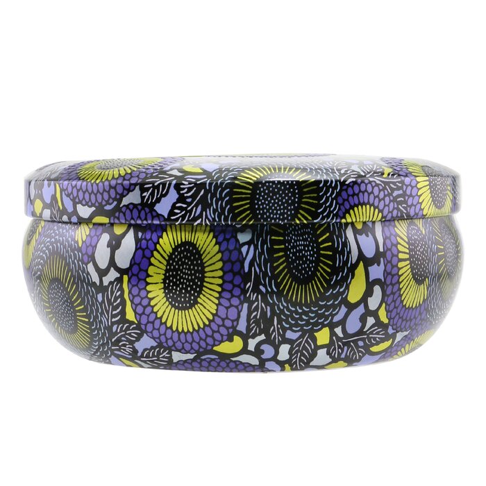 A highly decorative, heavenly-scented tin candle Made with proprietary coconut wax blend with three cotton wicks Warms your space with a soft, inviting fragrance Dimensions: 5.31" D x 2.36" H Burn time is approximately 40 hours Housed in a beautifully patterned metallic tin adorned with rich jewel tones Hand-poured in the U.S.A. Free of phthalates, parabens, sulfates & animal testing Caution: Burn on a heat resistant surface. Do not drop foreign matter or wick-trimmings into candle. Burn in an open area away from drafts. Keep candle burning within sight. Keep out of reach of children & pets